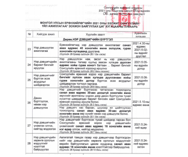 Ерөнхийлөгчид нэр дэвшигчийг бүртгэхээс татгалзсан тохиолдолд баримт бичгийн зөрчлийг арилган (2021.5.10-ны дотор) дахин бүртгүүлэх боломжийг хуульд суулгажээ.