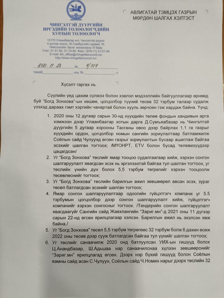 Тэгвэл Чингэлтэй дүүргийн ИТХ-ын төлөөлөгчөөс эл хөшөөний асуудлыг шалгуулахаар АТГ-т хандсан байна.
