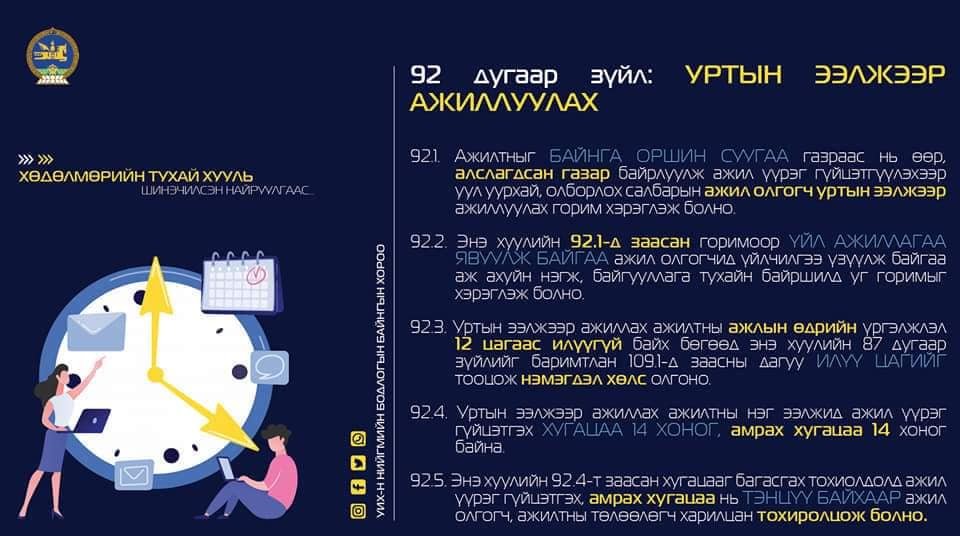 - Ажилтныг өдөрт үндсэн 8 цагаар ажиллуулна, хэрэв илүү цагаар ажилуулбал хоногт 4-өөс илүү цаг ажиллуулахгүй