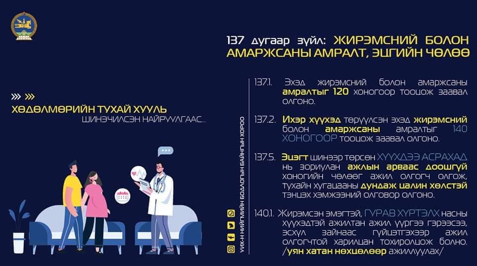 - Мөн шинээр төрсөн хүүхдээ асрахад нь зориулж эцэгт ажлын 10-аас доошгүй хоногийн чөлөөг цалинтай олгох зохицуулалтыг тусгасан юм