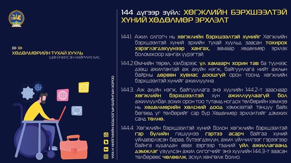 Шинэ оноос хэрэгжиж эхэлсэн хэд хэдэн хууль байгаагийн нэг нь Хөдөлмөрийн тухай хууль. Ажиллаж, хөдөлмөрлөж байгаа бүх хүнд хамааралтай энэ хуулийн 70 гаруй хувьд нь өөрчлөлт ороод байна. Ялангуяа эдийн засгийн хүнд үед аж ахуй нэгжүүдийг дэмжих, цалингаа цагт нь тавиагүй бол хүлээлгэх хариуцлага, илүү цагийн дээд хэмжээ зэргийг тодорхойлж өгчээ. Мөн шинээр зайнаас ажиллах үед дагаж мөрдөх зохицуулалтыг хуульд тусгажээ.
