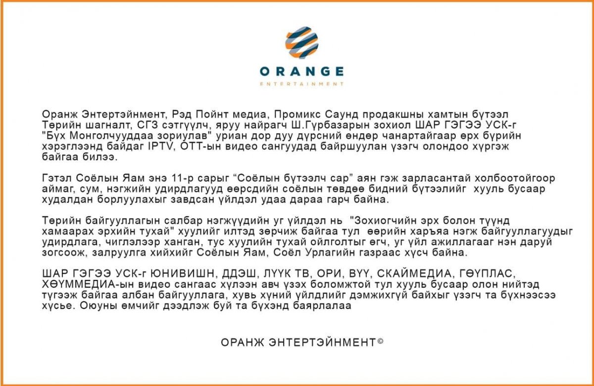 "Оранж" энтертэйнмент, "Рэд Пойнт Фильм", "Промикс Саунд" продакшны хамтын бүтээл бөгөөд Соёлын яаманд хандаж, МЭДЭГДЭЛ гаргажээ.