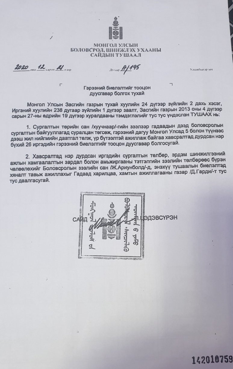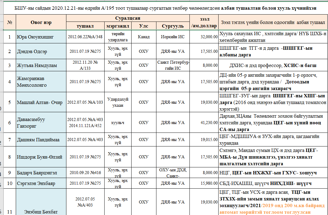 Тухайлбал, Төрийн Албаны Зөвлөлийн дарга Л.Цэдэвсүрэн БШУ-ны сайдаар ажиллаж байхдаа буюу 2020 онд тушаал гаргаж, хууль зөрчин БЗС-аас зээл авсан 26 хүний ЗЭЭЛИЙГ ТЭГЛЭСЭН байна.