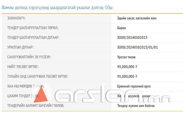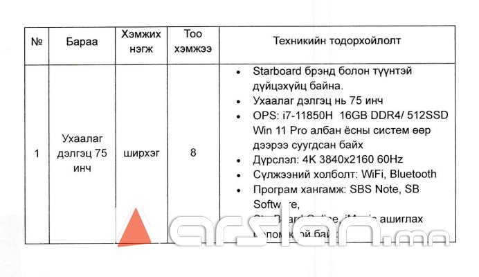 Тодруулбал, нийт төсөвт өртөг нь 95,000,000 төгрөг бөгөөд яамны дотоод хэрэгцээнд зориулж 75 инчийн ухаалаг дэлгэц авахаар болжээ.