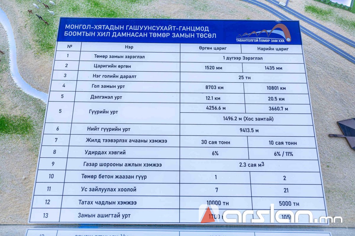 Гашуунсухайт-Ганцмод хил дамнасан төмөр зам нь 1-р зэрэглэлийн, 1520 мм өргөн цариг, 1435 мм нарийн царигийн хос замтай, гол замын урт 19,5 км, 8-31 метр өндөр дан болон хос замтай гүүрэн байгууламжтай, өргөн царигаар жилд 30 сая.тонн, нарийн царигаар жилд 10 сая.тонн ачаа тээвэрлэх хүчин чадалтай байх бөгөөд төслийн нийт төсөвт өртөг 902 тэрбум төгрөг.