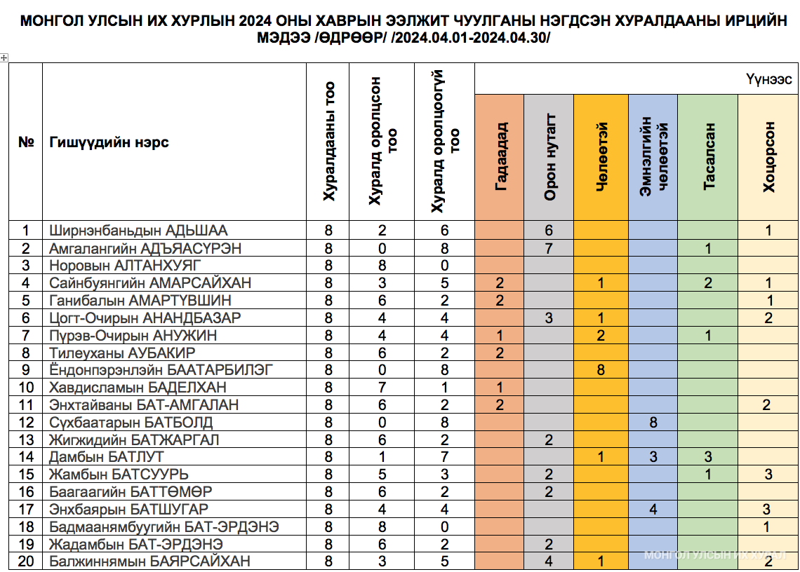 УИХ-ын тамгын газраас 2024 оны хаврын ээлжит чуулганы нэгдсэн хуралдааны дөрөвдүгээр сарын ирцийн мэдээг гаргажээ. Нийт найман удаагийн хуралдаанд бүрэн ирцтэй оролцсон 13 гишүүн байна.