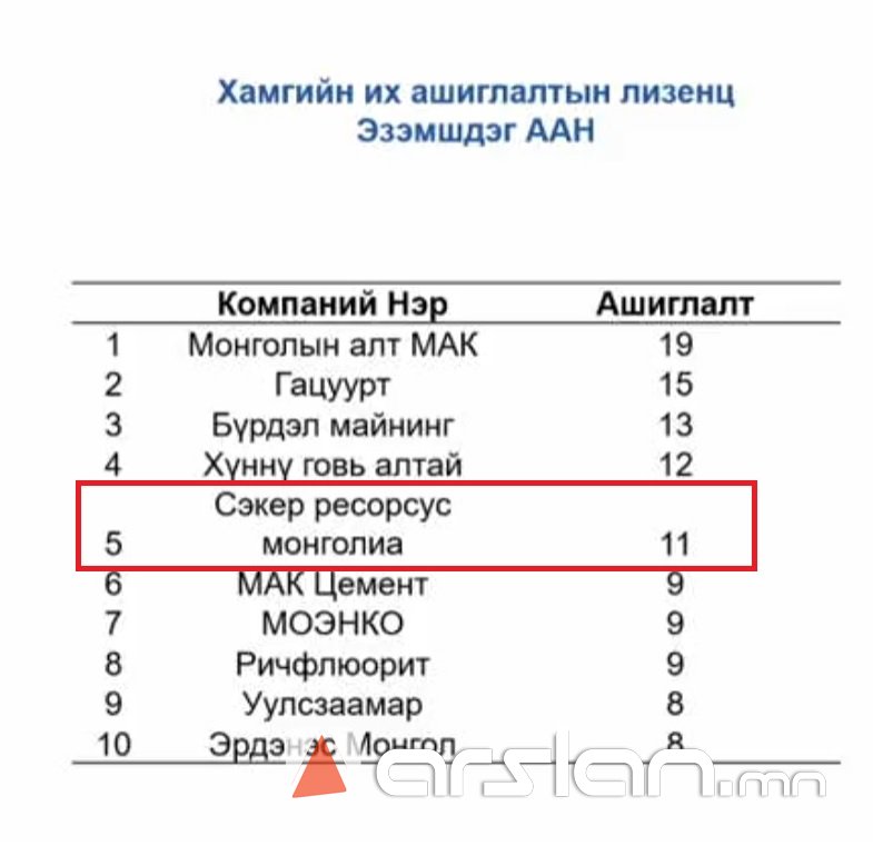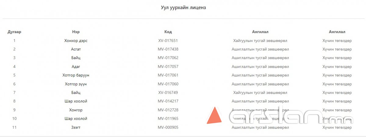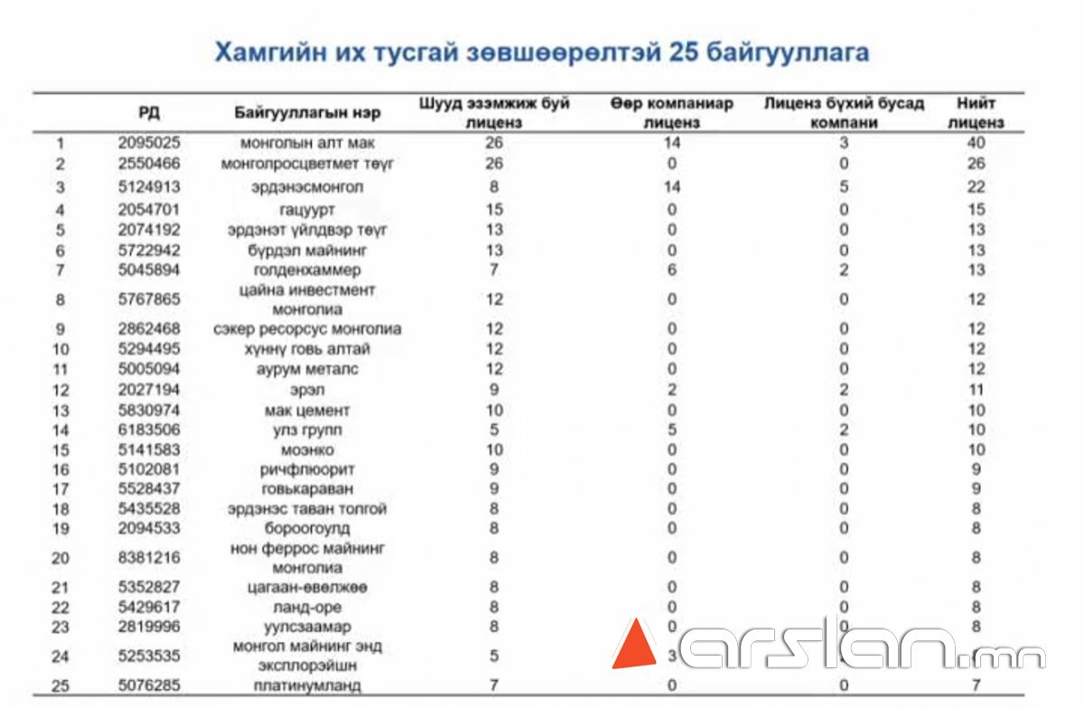 Ашигт малтмалын тусгай зөвшөөрөл эзэмшдэг аж ахуйн нэгжүүдийн мэдээллийг нэгтгэж үзсэн. "МАК", "Гацуурт", "Сэкер ресорсус монголиа" компаниуд ашигт малтмалын ашиглалтын хамгийн олон лиценз эзэмшдэг гэв.