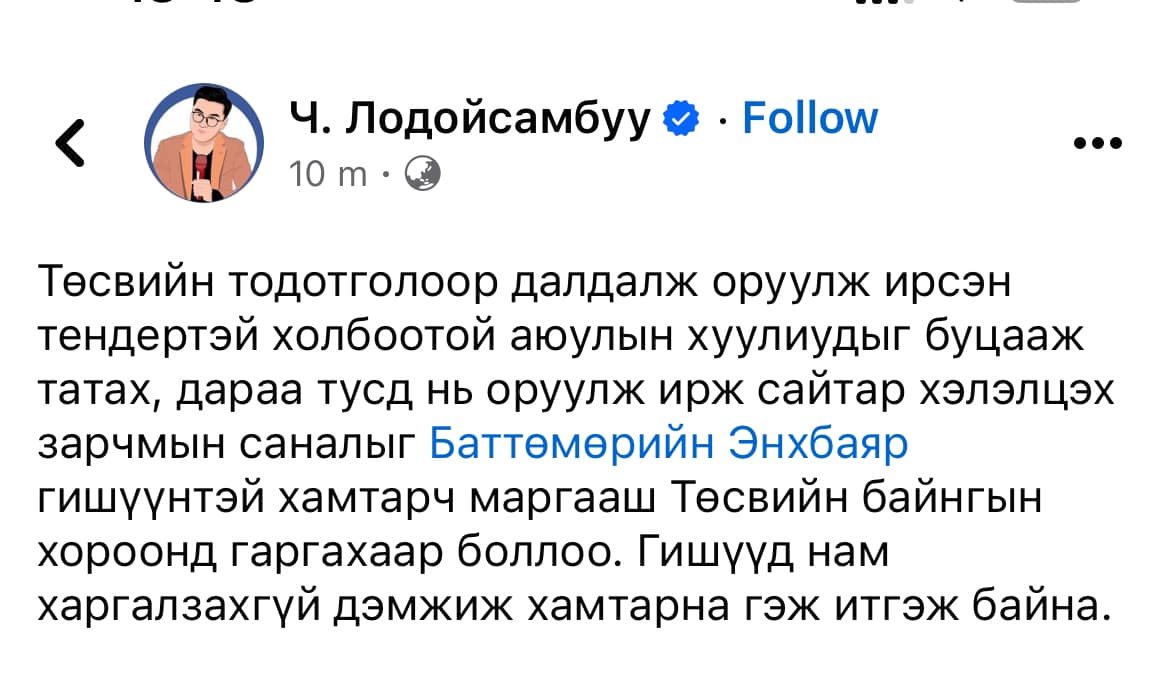 Тодруулбал, 40 тэрбум ам долларын төсөл, хөтөлбөрийг нээлттэй тендергүйгээр, УИХ-ын хяналтаас гадуур шийдвэрлэх гэсэн тендерийн хуулийн өөрчлөлтийг Засгийн газарт буцаах саналыг гаргахаар болсон гэж УИХ-ын гишүүн Б.Энхбаяр өөрийн цахим хуудаснаа мэдээлжээ.