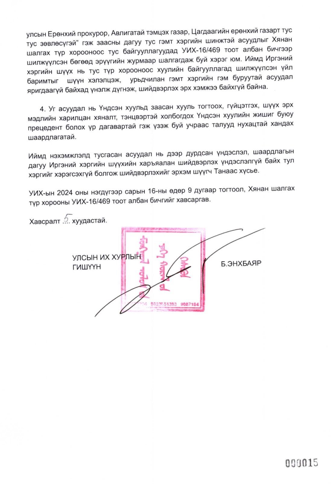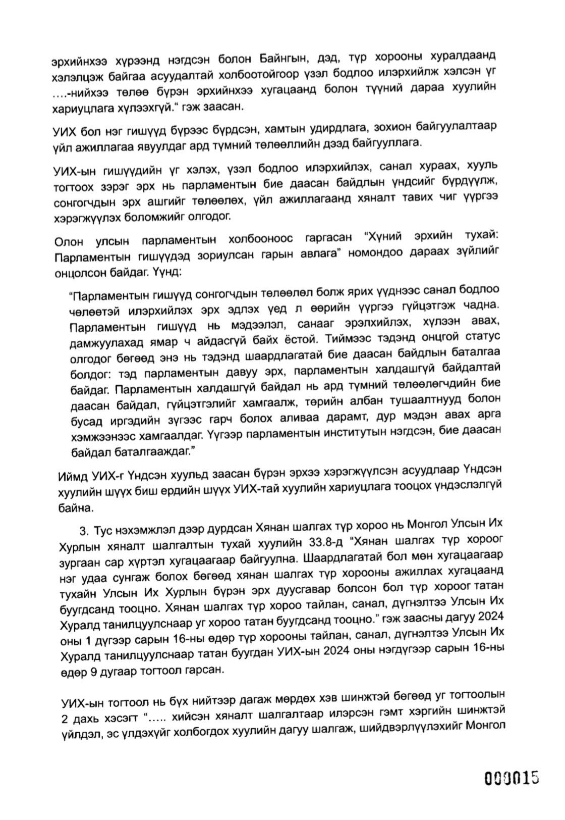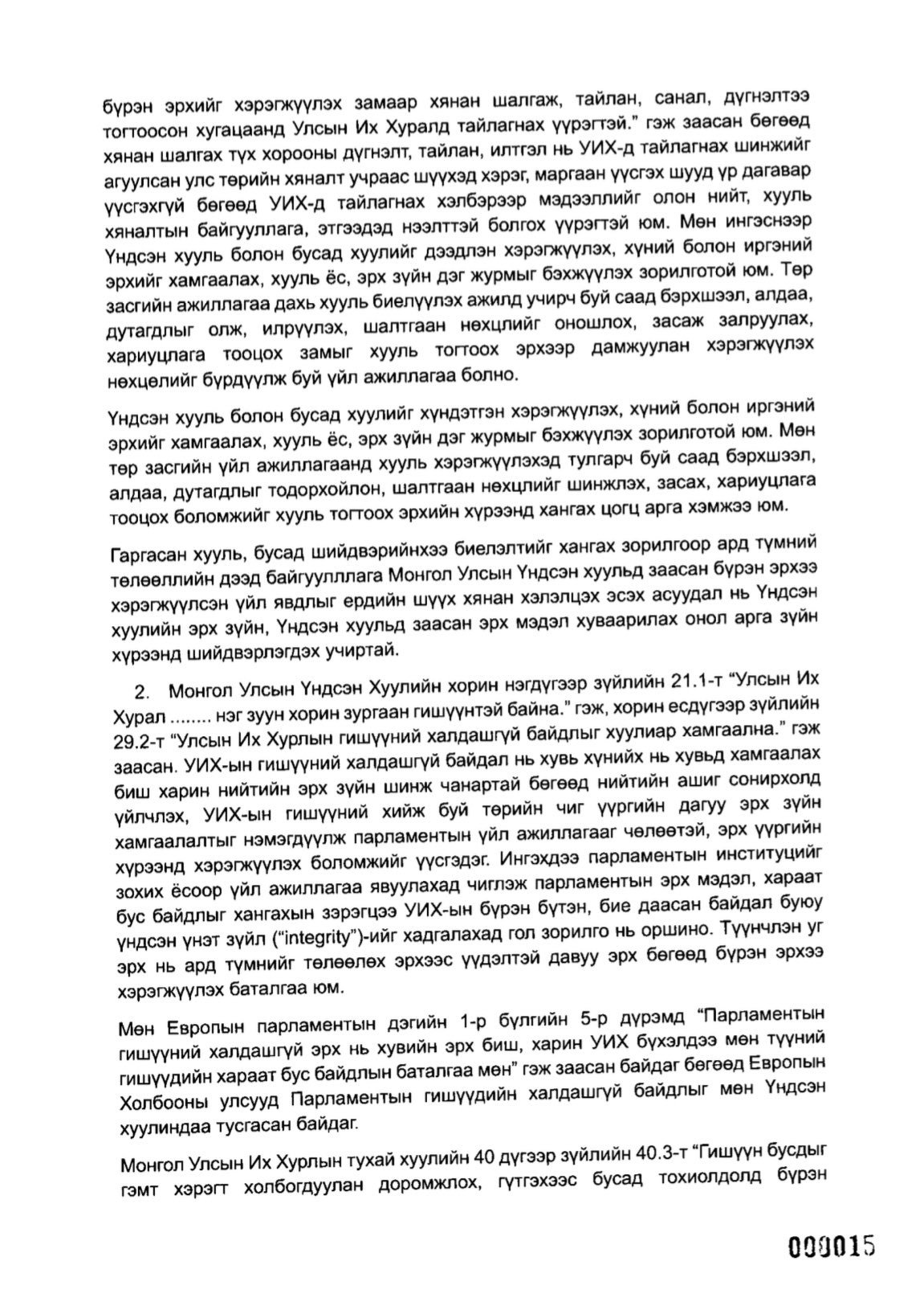 Тэд ард түмнийг мартамхай, нэхэл хатуу биш, нүглийн нүдийг гурилаар аргалчихна гэдэгтээ итгэж байгаа. Шүүхийн энэ асуудал нь хувь иргэн хоорондын асуудал биш Монгол Улсын Үндсэн хуульд заасан институт хоорондын, эрх мэдэл хуваарилах онол ба хэрэгжилтийн хувь заяатай холбогдох жишиг прецедент болох үр дагавартай гэж үзэж шүүхэд хандсан тайлбар, хүсэлтээ нээлттэй тавьж байна" гэж мэдэгдлээ.
