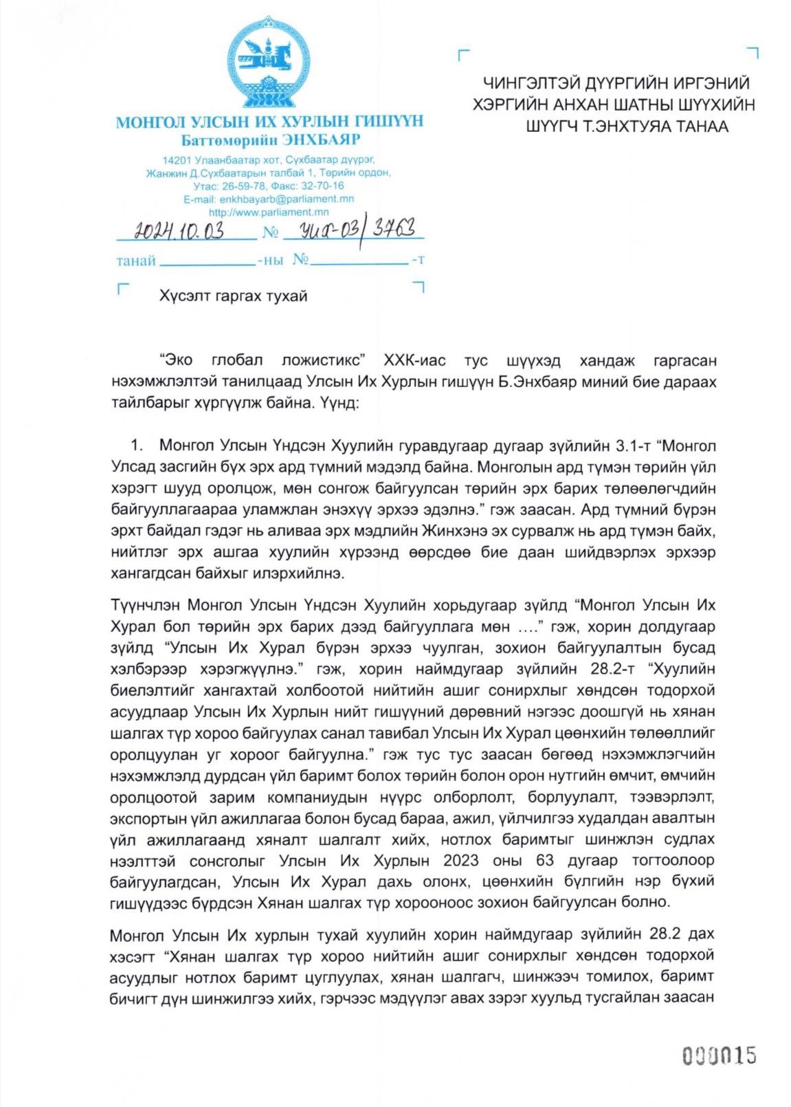 “Эко глобал ложистикс” компани Б.Энхбаяр гишүүнийг шүүхэд өгчээ
