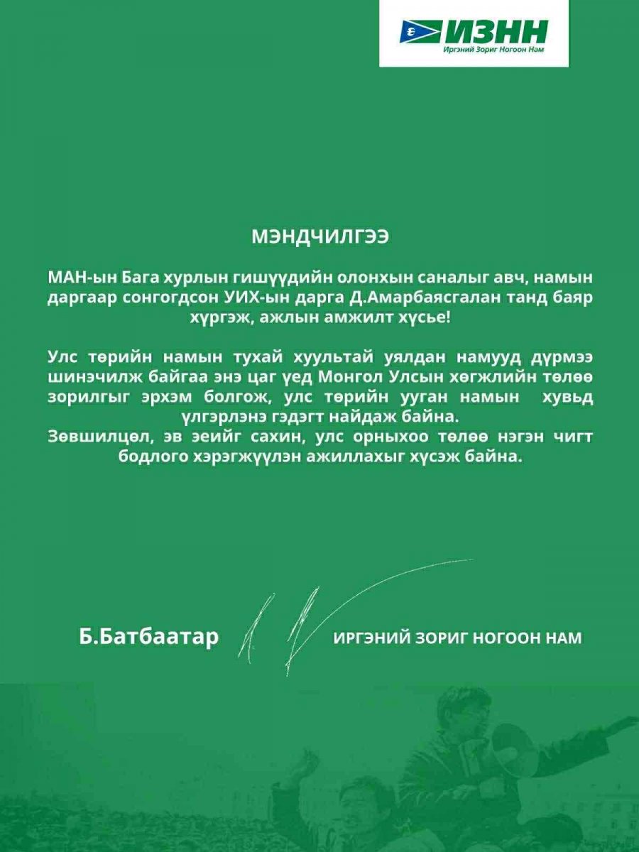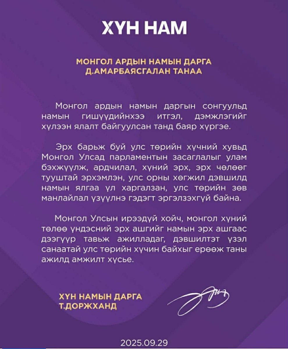 ХҮН нам, Бүгд Найрамдах Нам, Иргэни зориг ногоон намаас МАН-ын даргаар сонгогдсон Д.Амарбаясгаланд баяр хүргэж, амжилт хүсэв.