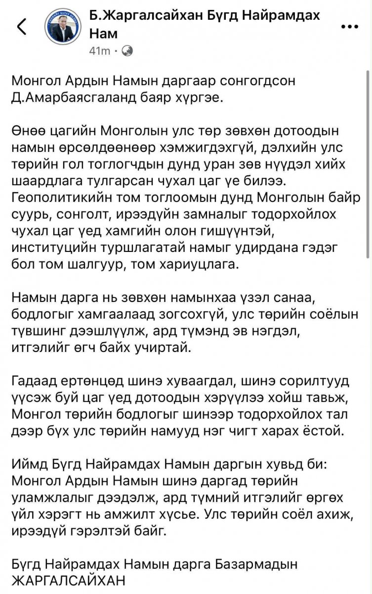 ХҮН нам, ИЗНН болон Бүгд Найрамдах намаас МАН-ын даргаар сонгогдсон Д.Амарбаясгаланд баяр хүргэж, амжилт хүсэв