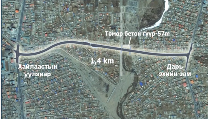 Гадна тойруугийн хойд хэсгийн замын 3 дугаар хэсэг болох СБД-ийн 13 дугаар хороо, БЗД-ийн 21 дугаар хорооны Хайлаастын уулзвараас Дарь эхийн зам хүртэл 1.4 км авто зам, 57 у/м төмөрбетон гүүрийн барилгын ажил үргэлжилж байна.