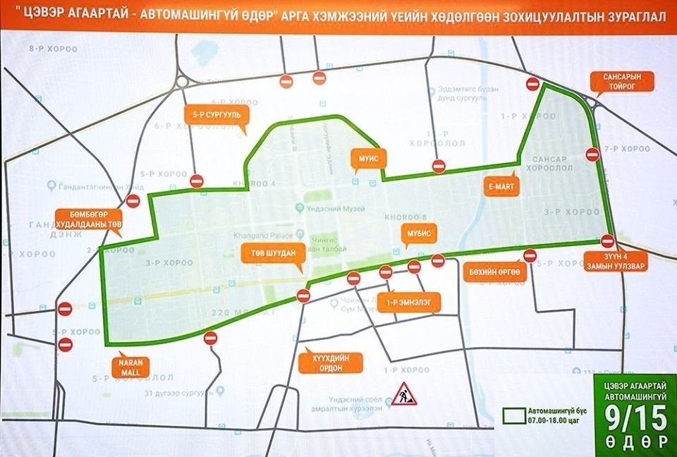 Есдүгээр сарын 15-ны Ням гарагт нийслэлд автомашингүй өдөр болно. Автомашингүй өдрөөр дараах чиглэлийн замууд 15-ны өдрийн 07:00-18:00 цагийн хооронд хаагдах юм байна. Үүнд: