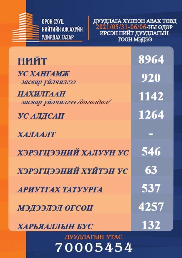 ОСНААУГ: Өнгөрсөн долоо хоногт 8964 дуудлага мэдээлэл ирснээс ус алдсан 1264 дуудлага бүртгэгджээ