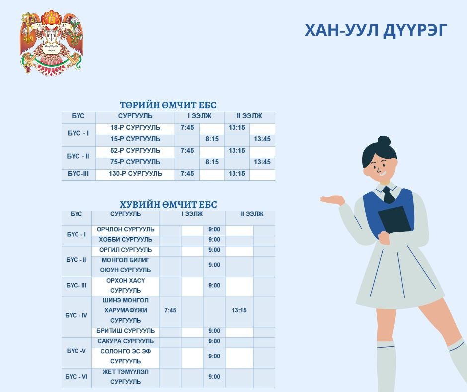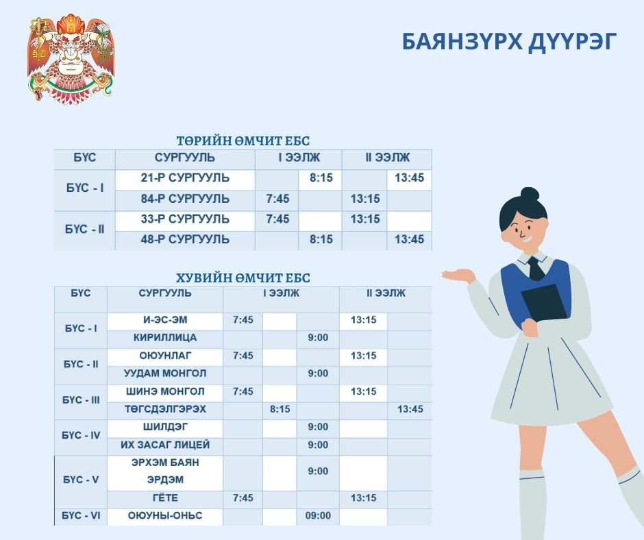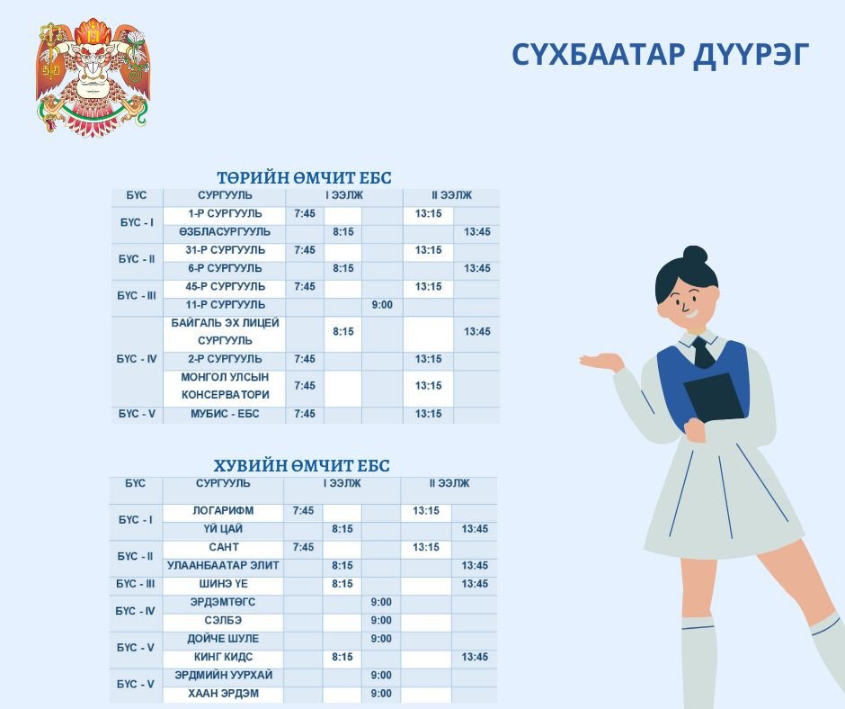 Тэгвэл, өнөөдрөөс эхлэн шинэ цагийн хуваариар хичээллэх ЕБС-иудыг танилцуулж байна.