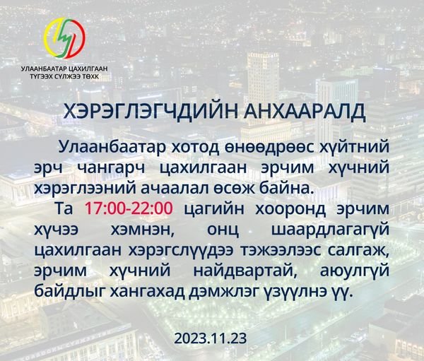 "Улаанбаатар хотод өнөөдрөөс хүйтний эрч эрс чангарч цахилгаан, эрчим хүчний хэрэглээ өсөж байна. Та 17:00-22:00 цагийн хооронд эрчим хүчээ хэмнэн, онц шаардлагагүй цахилгаан хэрэгслээ тэжээлээс салгаж, эрчим хүчний найдвартай, аюулгүй байдлыг хангахад дэмжлэг үзүүлнэ үү" гэжээ.