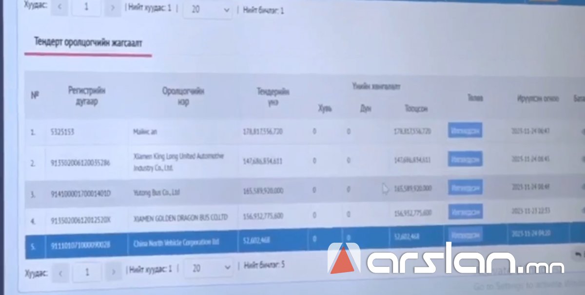 “Ногоон автобусны” гэх асуудалтай холбогдуулан 600 автобус худалдан авах тендерийг шинээр зарласан. Тендерийн нийт төсөвт өртөг 183 тэрбум бөгөөд доорх таван компани тендерт хүсэлтээ ирүүлжээ.
