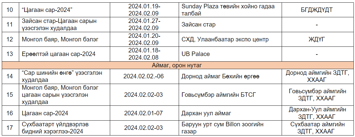 Цагаан сард зориулсан үзэсгэлэн худалдаа зохион байгуулж буй газруудын мэдээллийг хүргэж байна.