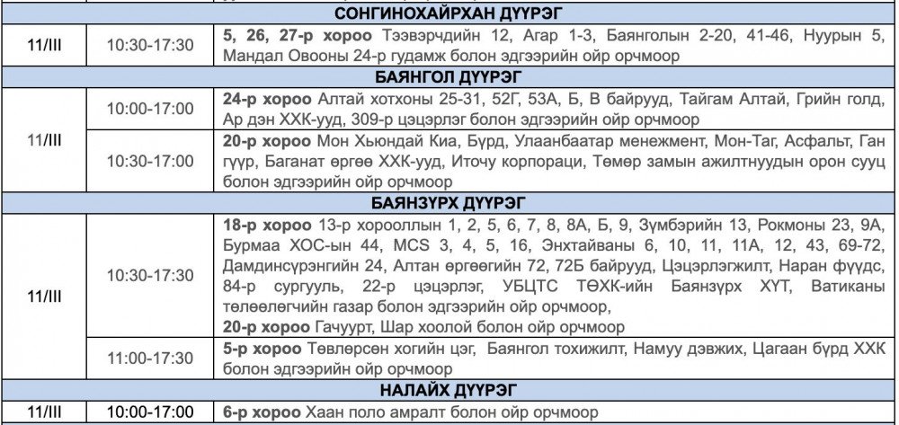 Тодруулбал, Сонгинохайрхан, Баянгол, Баянзүрх, Налайх дүүргийн доорх байршлуудад өдрийн турш буюу 10:00-17:30 цаг хүртэл цахилгааны хязгаарлалт хийх юм байна.