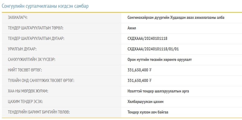 Уг тендерийг энэ сарын 13-ны өдөр зарласан бөгөөд нийт төсөвт өртөг нь 331,650,400 төгрөг байна.