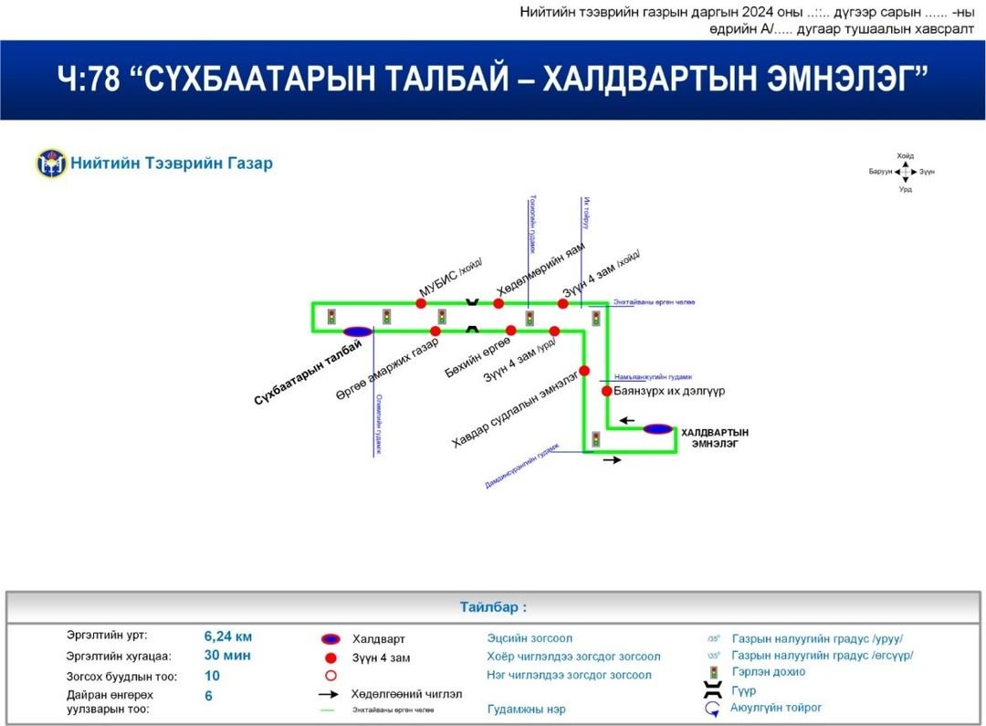 Баянзүрх дүүргийн 14, 42 дугаар хороодын иргэдийн зорчих эрэлт хэрэгцээг хангах, нийтийн тээврийн үйлчилгээний хүртээмжийг нэмэгдүүлэх зорилгоор Ч:78 “Халдвартын эмнэлэг-Сүхбаатарын талбай” чиглэлийг шинээр нээж 2024 оны 04 дүгээр сарын 23-ны өдрөөс үйлчилгээг эхлүүлэхээр төлөвлөжээ.