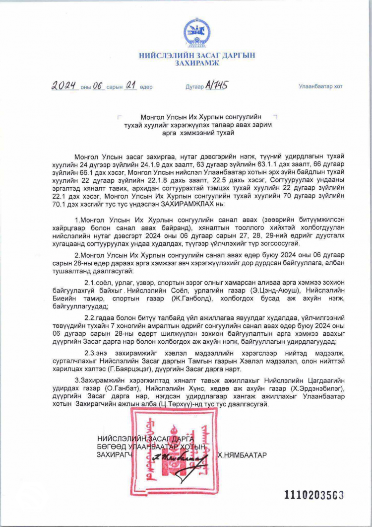 Эдгээр хориглосон зохицуулалтад аймаг, нийслэлийн Засаг дарга холбогдох шийдвэр гарган хяналт тавьж ажиллах юм. Нийт 1341 нэр дэвшигчийн сонгуулийн сурталчилгаа нь зургаадугаар сарын 26-ны өдрийн 23:59 цагт албан ёсоор зогсоно.