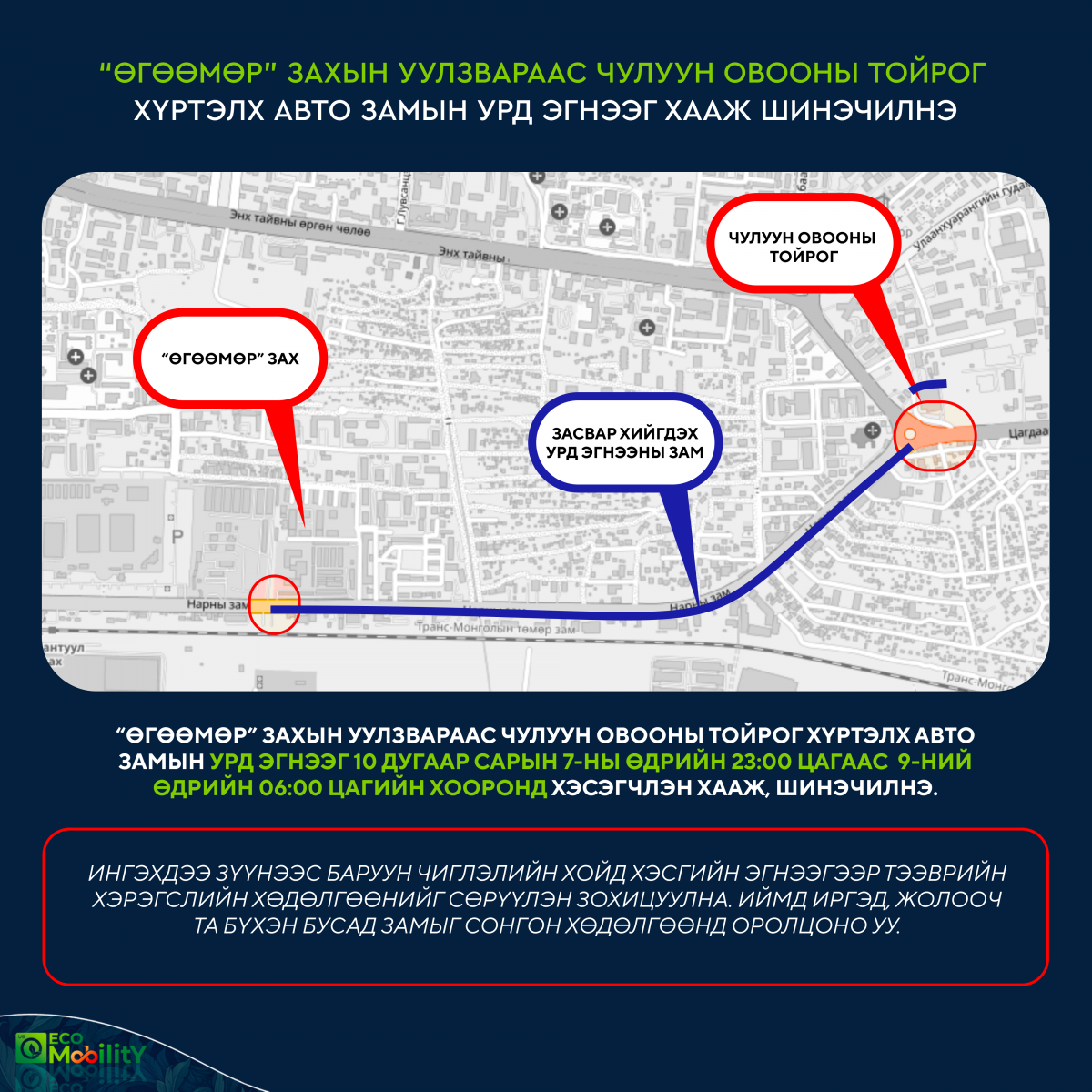 Мөн маргааш "Өгөөмөр" захын уулзвараас Чулуун овооны тойрог хүртэлх авто замын урд эгнээг 10 дугаар сарын 7-ны өдрийн 23:00 цагаас 10 дугаар сарын 9-ний өдрийн 06:00 цагийн хооронд хэсэгчлэн хааж, шинэчлэхээр төлөвлөжээ. Ингэхдээ зүүнээс баруун чиглэлийн хойд хэсгийн эгнээгээр тээврийн хэрэгслийн хөдөлгөөнийг сөрүүлэн зохицуулна.