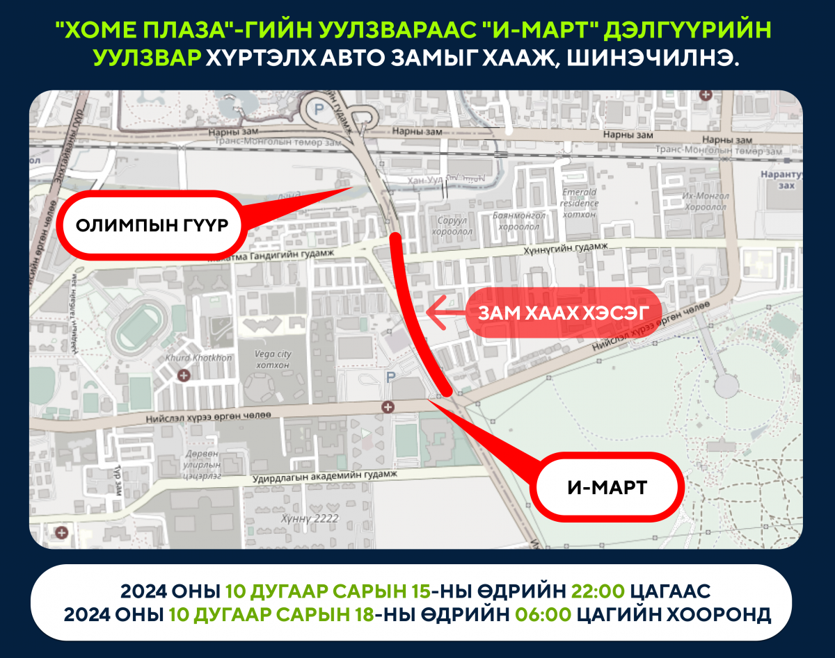 “Хоме плаза"-гийн уулзвараас "И-Март" дэлгүүрийн уулзвар хүртэлх авто замыг аравдугаар сарын 15-ны өдрийн 22:00 цагаас 18-ны өдрийн 06:00 цагийн хооронд хааж, шинэчилнэ.