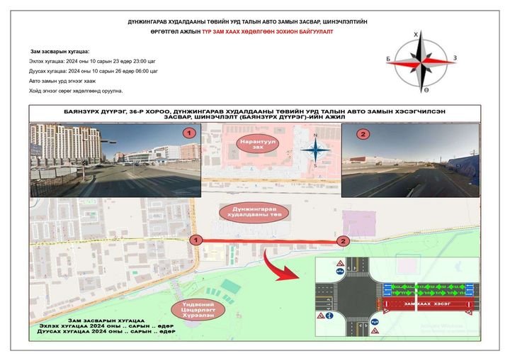 - Баянзүрх дүүрэг, 36 дугаар хороо, Дүнжингарав худалдааны төвийн баруун урд уулзвараас 133 дугаар сургууль хүртэлх авто замын суурь хучилтын ажлыг 2024 оны 10 дугаар сарын 23-ны өдрийн 23:00 цагаас 10 дугаар сарын 26-ны өдрийн 06:00 цагийн хооронд хааж засварлана.