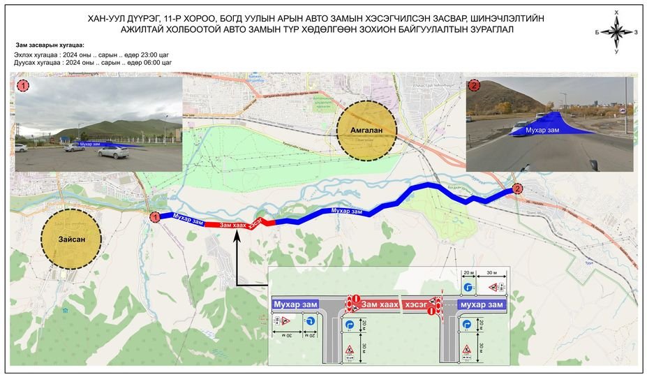 - Баянзүрх дүүрэг, 11-р хороо, Богд уулын арын авто зам “Бага тэнгэр”-ээс “Ривэр амралт" хүртэлх замыг хааж засвар, шинэчлэлтийн ажлыг 2024 оны 10 дугаар сарын 23-ны өдрийн 06:00 цагаас 10 дугаар сарын 26-ны өдрийн 06:00 цагийн хооронд засвар.