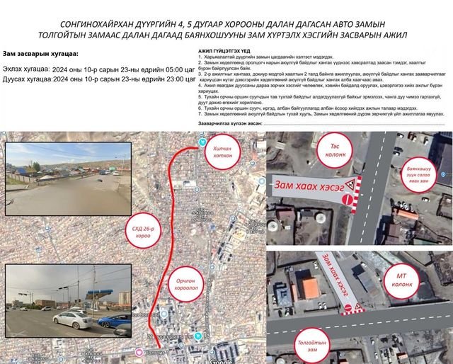 - Сонгинохайрхан дүүрэг, 4, 5-р хороо, Далан дагасан авто зам, Толгойтын замаас далан дагаад Баянхошууны зам хүртэлх авто замыг хааж засвар, шинэчлэлтийн ажлыг хийж гүйцэтгэнэ. 2024 оны 10 дугаар сарын 23-ны өдрийн 05:00 цагаас 10 дугаар сарын 23-ний өдрийн 23:00 цагийн хооронд засварлана.