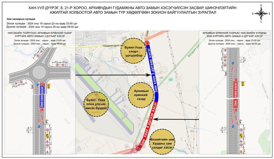 - Хан-Уул дүүрэг 8, 21-р хорооны нутаг дэвсгэр, Архивчдын гудамж, Архивын ерөнхий газраас Нисэхийн тойрог зам хүртэлх Урдаас хойшоо чиглэлийн зүүн талын авто замын 3 дугаар хэсгийн засварын ажлыг 2024 оны 10 дугаар сарын 23-ны өдрийн 23:00 цагаас 10 дугаар сарын 25-ний өдрийн 06:00 цагийн хооронд хааж засварлана. Хойноос урагш чиглэлийн баруун хэсгийн эгнээгээр тээврийн хэрэгслийн хөдөлгөөнийг сөрүүлэн зохицуулна.