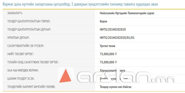 Нийслэлийн Иргэдийн Төлөөлөгчдийн хурлаас улсын төсвийн 75 сая төгрөг зарцуулж, Яармаг дахь нутгийн захиргааны цогцолбор, 3 давхрын хүндэтгэлийн танхимд ТАВИЛГА авахаар энэ сарын 8-ны өдөр тендер зарласан байна.