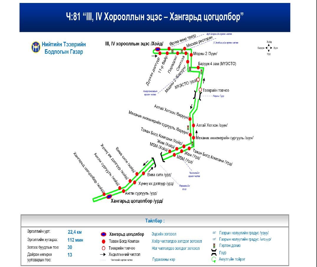 Уг чиглэлд “Зорчигч тээвэр дөрөв” ОНӨААТҮГ ажлын өдөр зургаа, амралтын өдөр таван тээврийн хэрэгслээр үйлчилгээ үзүүлдэг бөгөөд өдөрт дунджаар 1600 зорчигч үйлчлүүлдэг.