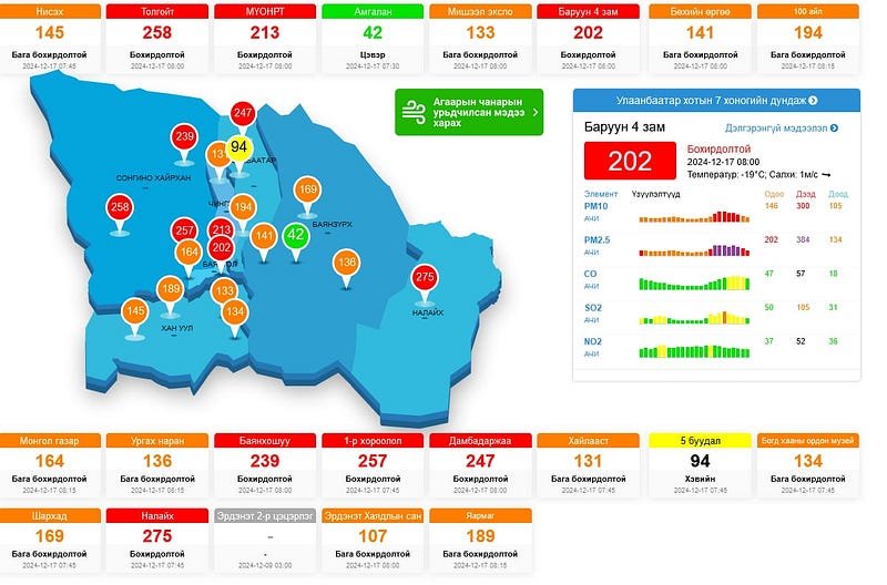 Мөн өнөө өглөөний 09:00 цагийн байдлаар Толгойт, МҮОНРТ, Баруун 4 зам, Баянхошуу, 1-р хороолол, Дамбадаржаа, Налайх орчмоор агаар бохирдолтой буюу 202-275 зааж байгаа бол, Нисэх, Мишээл экспо, Бөхийн өргөө,100 айл, Монгол газар, Ургах наран, Хайлааст, Богд хааны ордон музей, Шархад, Эрдэнэт Хаягдлын сан, Яармаг орчмоор агаарын бохирдол бага буюу 107-194 гэж заажээ.
