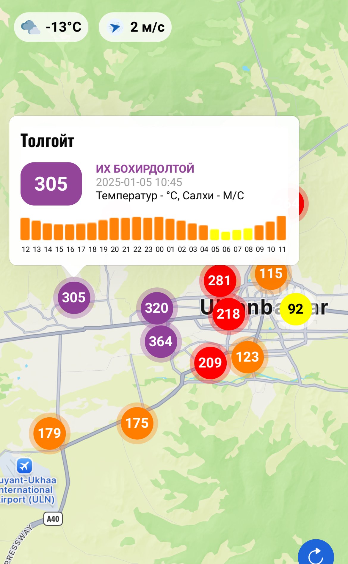Улаанбаатар хотын агаарын чанарын индекс өнөөдөр 09:30 цагийн байдлаар Толгойт, Баянхошуу, Хайлааст, Баруун 4 зам, Сонгинохайрхан дүүрэг орчимд хамгийн их агаарын бохирдолтой байна.