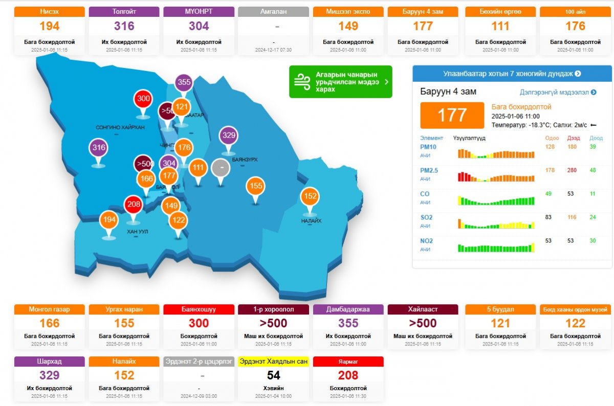 Өнөөдөр /2025.01.06/ 09:00 минутаас 09:30 цагийн үед агаарын чанар 1-р хороолол, Толгойтод агаар бохидол их байна. Харин Дамбадаржаа, Хайлааст, Яармагт агаар "бохирдолтой" байгаа юм.