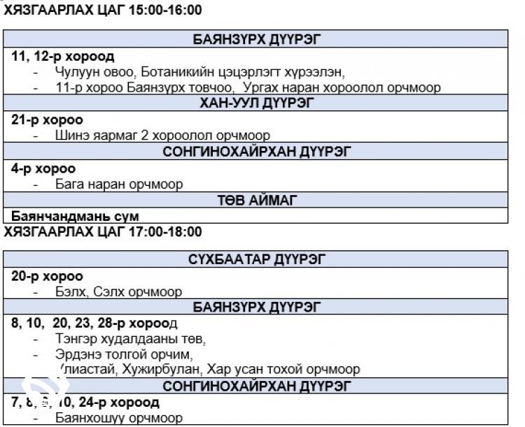 Өнөөдөр Баянзүрх, Сүхбаатар, Сонгинохайрхан дүүргийн зарим байршилд цахилгаан хязгаарлана