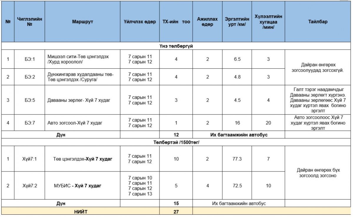 Үндэсний их баяр наадмын өдрүүдээр нийт 139 чиглэлд нийтийн тээврийн 975 автобус үйлчилгээнд ажиллана.