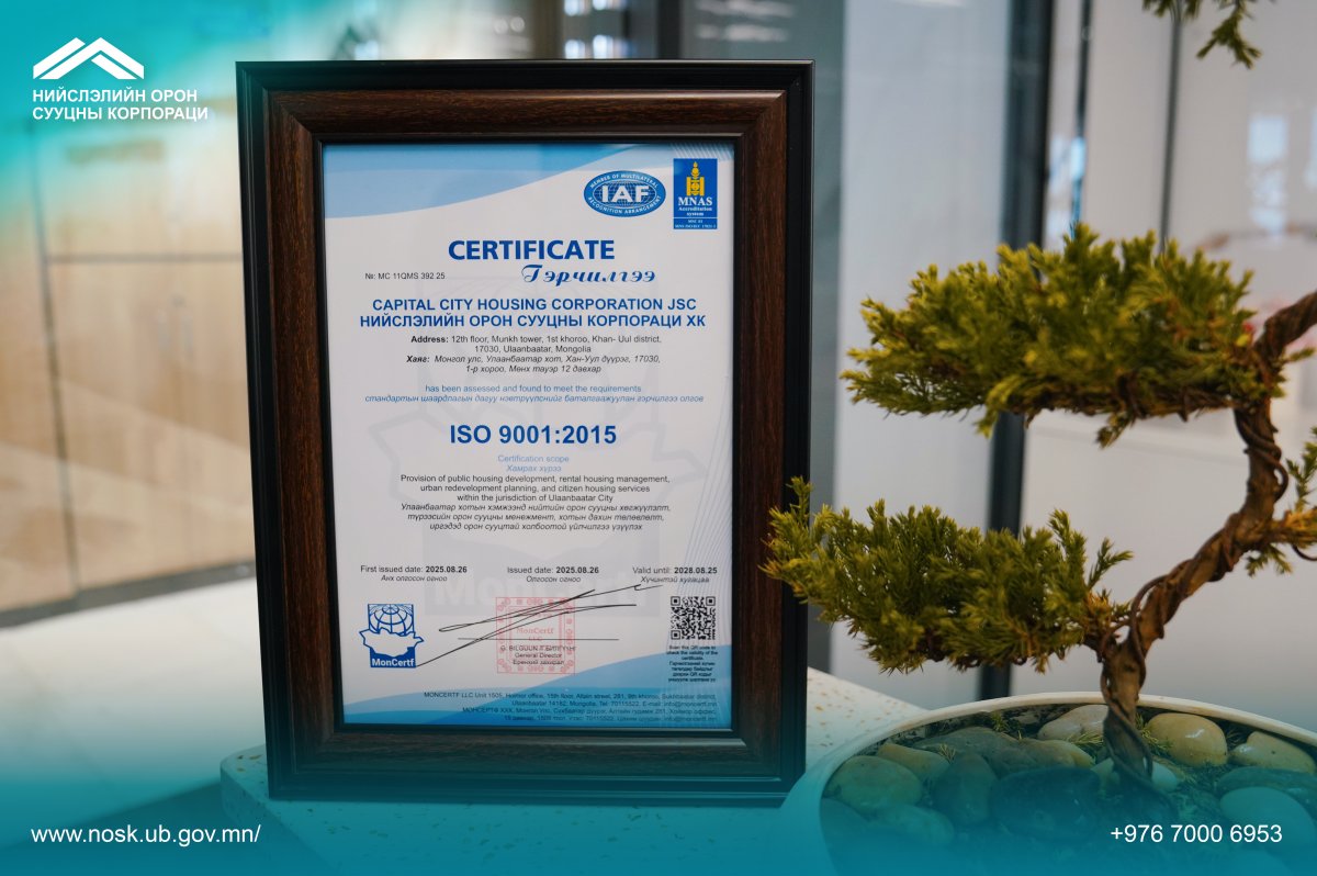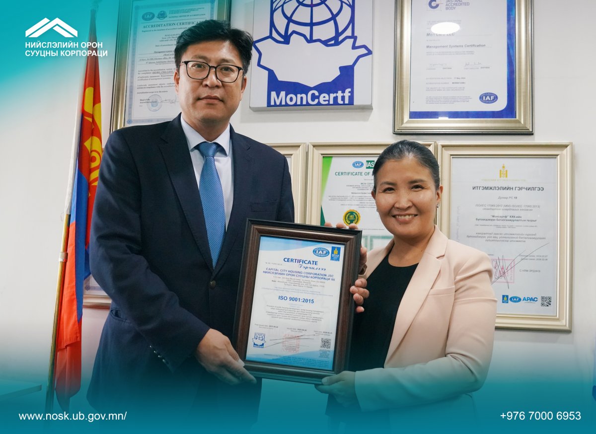 Нийслэлийн орон сууцны корпораци ХК Улаанбаатар хотын хэмжээнд нийтийн орон сууцны хөгжүүлэлт, түрээсийн орон сууцны менежмент, хотын дахин төлөвлөлт, иргэдэд орон сууцтай холбоотой үйлчилгээ үзүүлэх зэрэг иргэдийн эрүүл аюулгүй орчинд амьдрах нөхцөл боломжийг бүрдүүлэх чиглэлээр үзүүлж буй үйлчилгээнүүддээ ISO 9001:2015 Чанарын менежментийн тогтолцооны стандартыг нэвтрүүллээ.