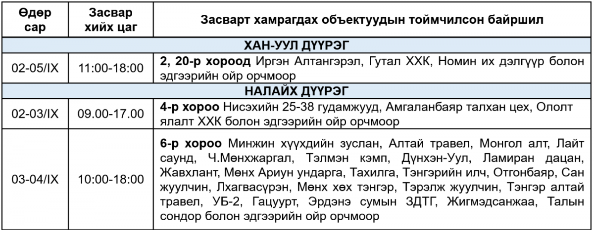 ЖИЧ: Цаг агаарын нөхцөл байдлаас шалтгаалан хуваарьт өөрчлөлт орвол, гэрээт бүртгэлтэй утасны дугаарт мэдээлэл хүргэх болно. Засварын ажлыг тухайн тоноглолоос хүчдэлээс бүрэн чөлөөлсний дараа хийдэг нөхцөл байдлыг харгалзан үзэж, хүлээцтэй хандахыг хэрэгчлэгч та бүхнээс хүсье.