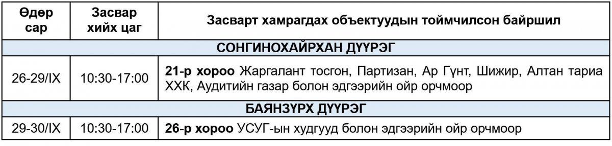ЖИЧ: Цаг агаарын нөхцөл байдлаас шалтгаалан хуваарьт өөрчлөлт орвол, гэрээт бүртгэлтэй утасны дугаарт мэдээлэл хүргэх болно. Засварын ажлыг тухайн тоноглолоос хүчдэлээс бүрэн чөлөөлсний дараа хийдэг нөхцөл байдлыг харгалзан үзэж, хүлээцтэй хандахыг хэрэгчлэгч та бүхнээс хүсье.