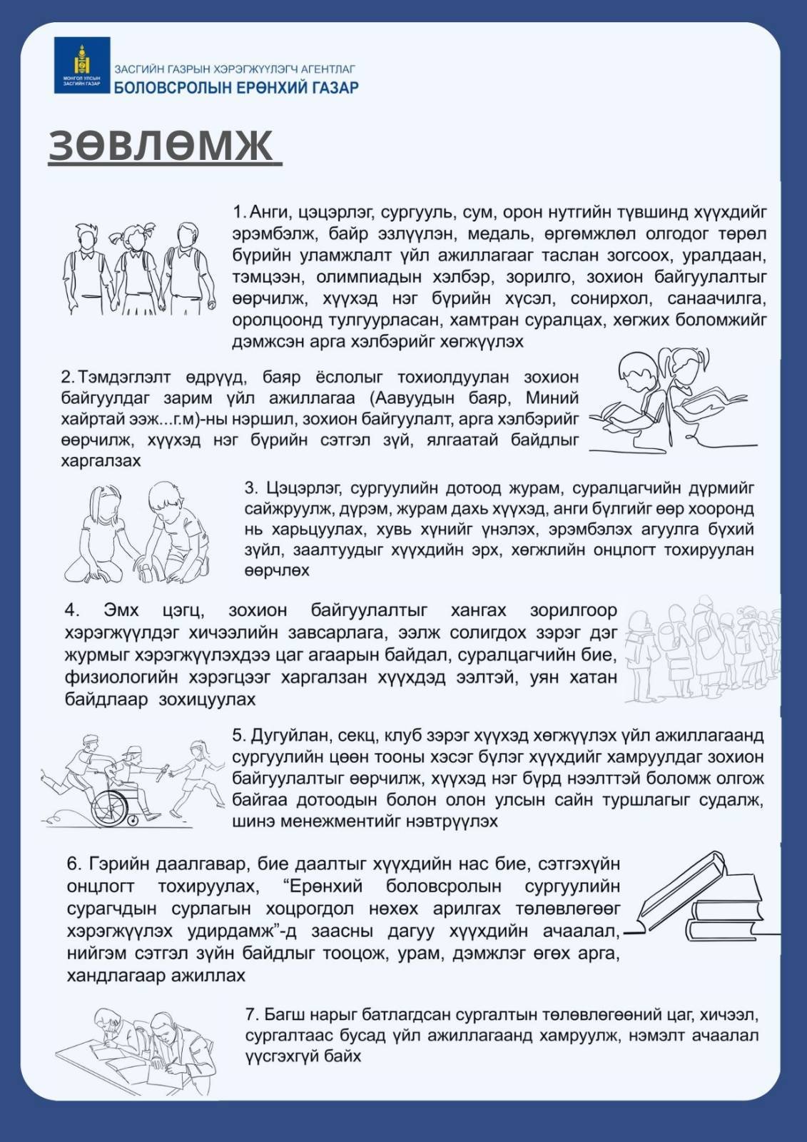 Мөн хүүхэд бүрийг дугуйлан, секцэд хамруулж, гэрийн даалгаврыг хүүхдийн онцлогт тохируулан өгөхийг багш нарт зөвлөжээ.