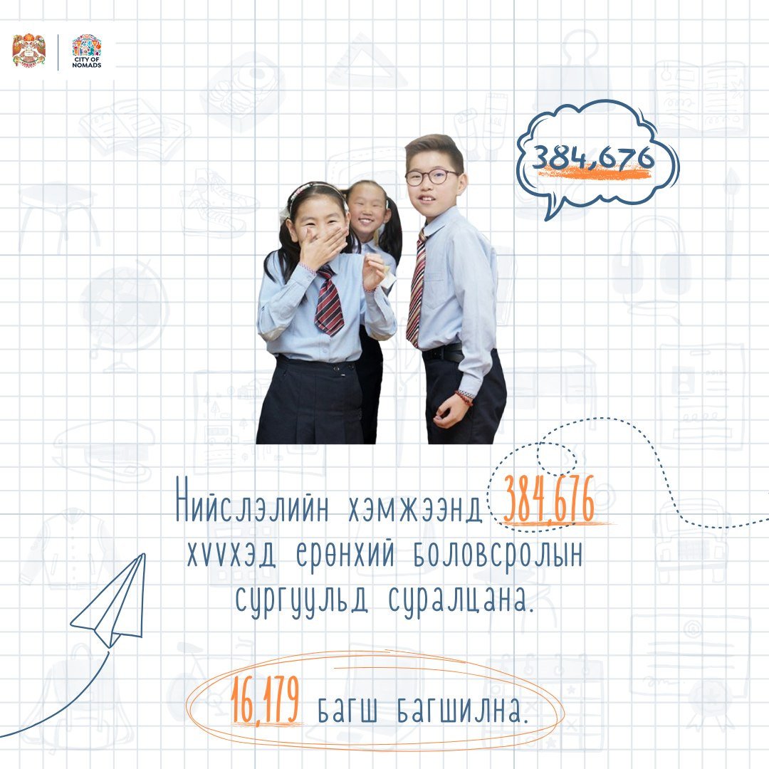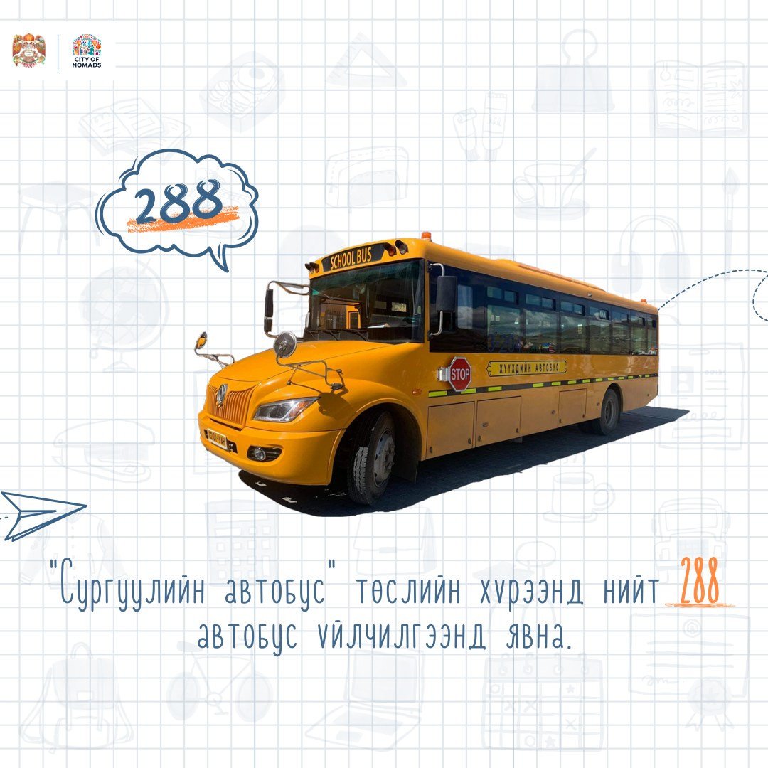 Түүнчлэн Сургуулийн автобус" төслийн хүрээнд нийт 288 автобус үйлчилгээнд явна. Энэ хичээлийн жилд нийслэлд нийт 307 ерөнхий боловсролын сургууль үйл ажиллагаа явуулж байгаа бөгөөд I-V ангийн сурах бичиг 100 хувь төрөөс үнэ төлбөргүй хангана хэмээн Нийслэлийн Засаг даргын тамгын газрын Хэвлэл мэдээлэл, олон нийттэй харилцах хэлтсээс мэдээлэв.