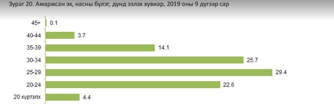 Амаржсан эхчүүдийг насны бүлгээр харвал 4.4 хувь нь 20 хүртэлх насны, 91.8 хувь нь 20-39 насны,3.8 хувь нь 40-өөс дээш насныхан байна.