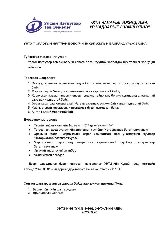 УНТЭ: Сул ажлын байрны сонгон шалгаруулалтад оролцохыг урьж байна