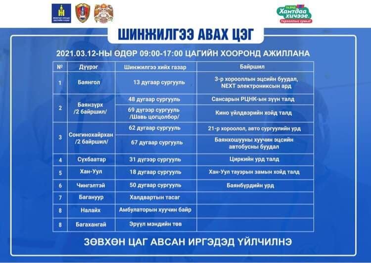 Нийслэлийн хэмжээнд өнөөдөр дараах цэгүүдэд коронавирусийн халдвар илрүүлэх PCR шинжилгээг авна.