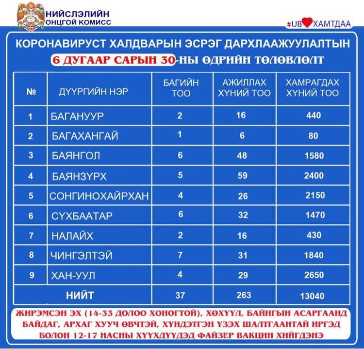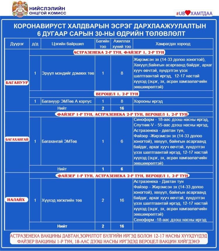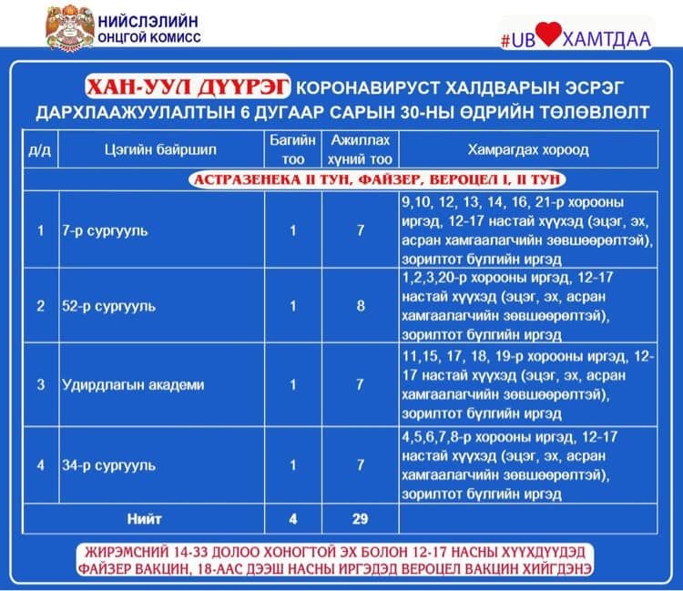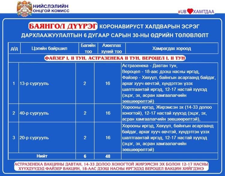 Улаанбаатар хотод өнөөдөр суурин 23 цэгт 37 багийн 263 эмч, ажилтан ажиллана. Эдгээр цэгт нийт 13,040 иргэнийг дархлаажуулахаар төлөвлөсөн байна.