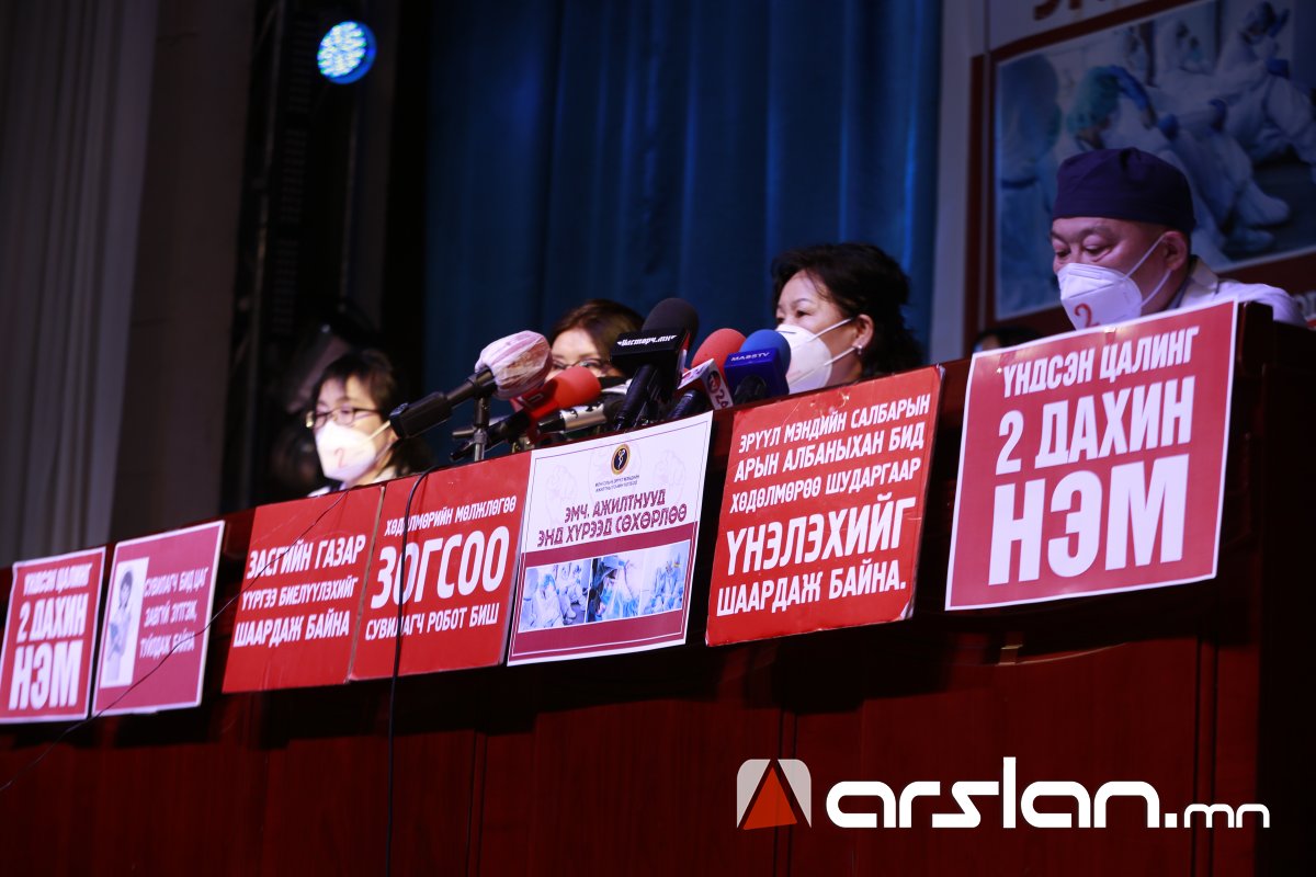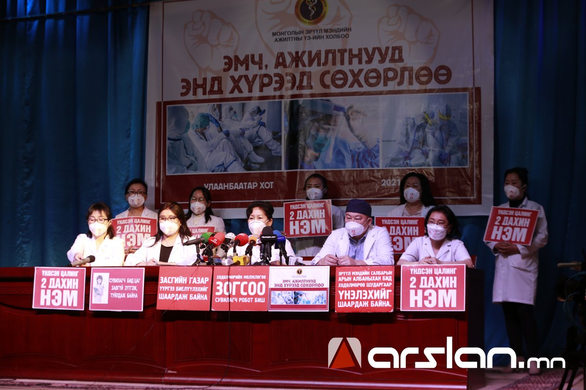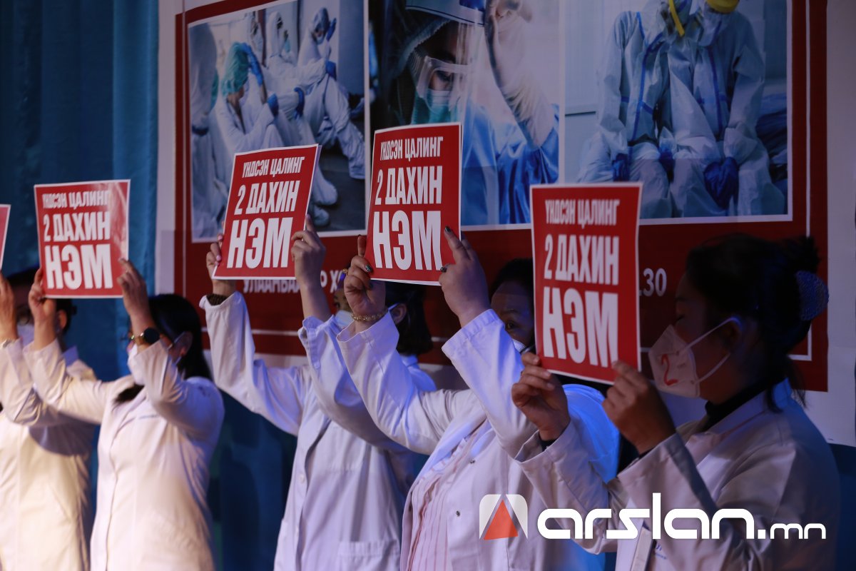 Эмч, ажилтнууд “Үндсэн цалинг хоёр дахин нэм. Сувилагч бид цаг завгүй зүтгэж, туйлдаж байна. Засгийн газар үүргээ биелүүлэхийг шаардаж байна” хэмээх бичгүүдийг барьжээ.